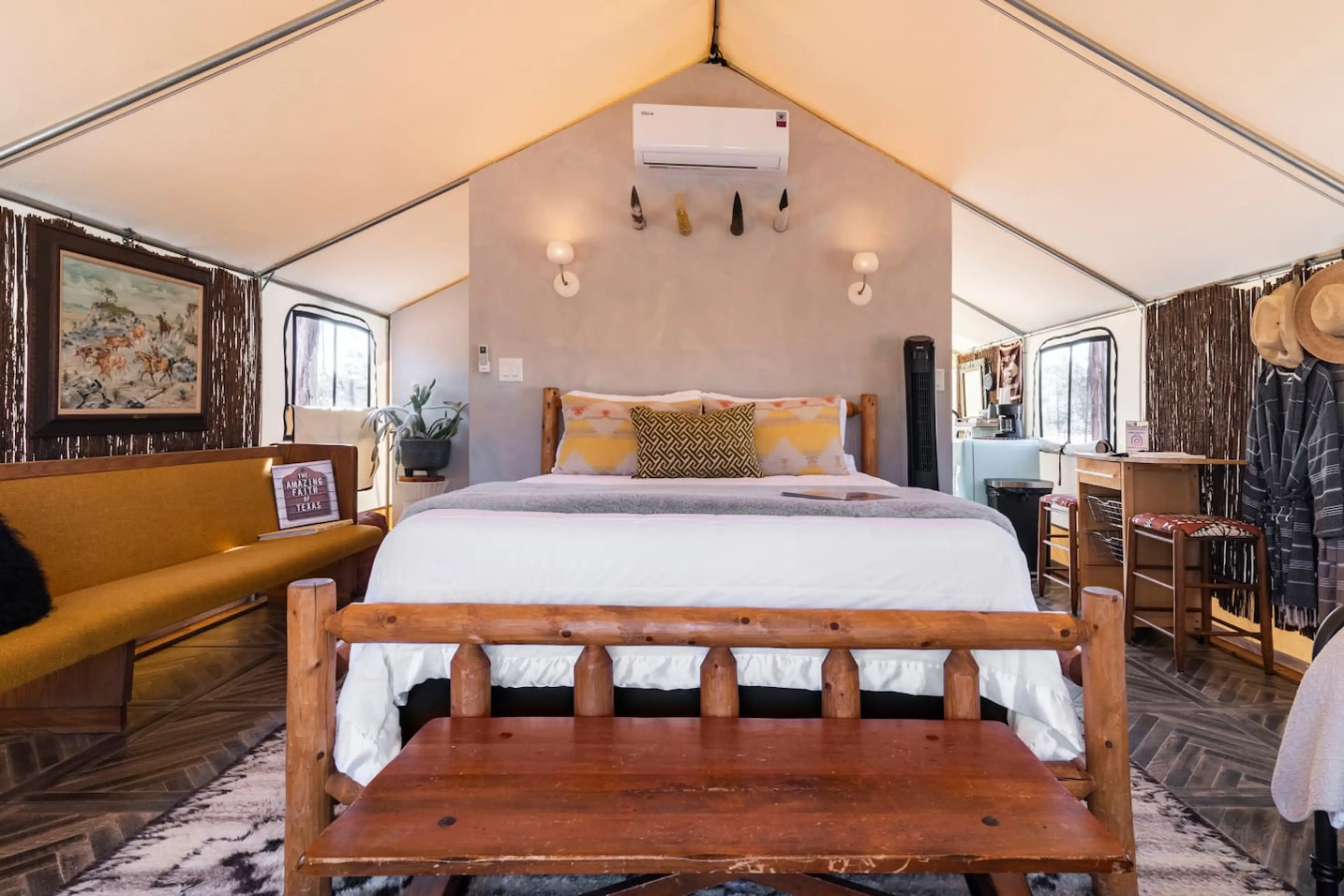 Glamping under the Stars + Pool * Strict - NO Pets These canvas wall tents have been designed to offer you everything you need during your stay. Each tent is fully plumbed, private bathroom/shower, hot water, kitchenette, AC and HEAT unit plus a wood burning stove. There are only two tents with a ...